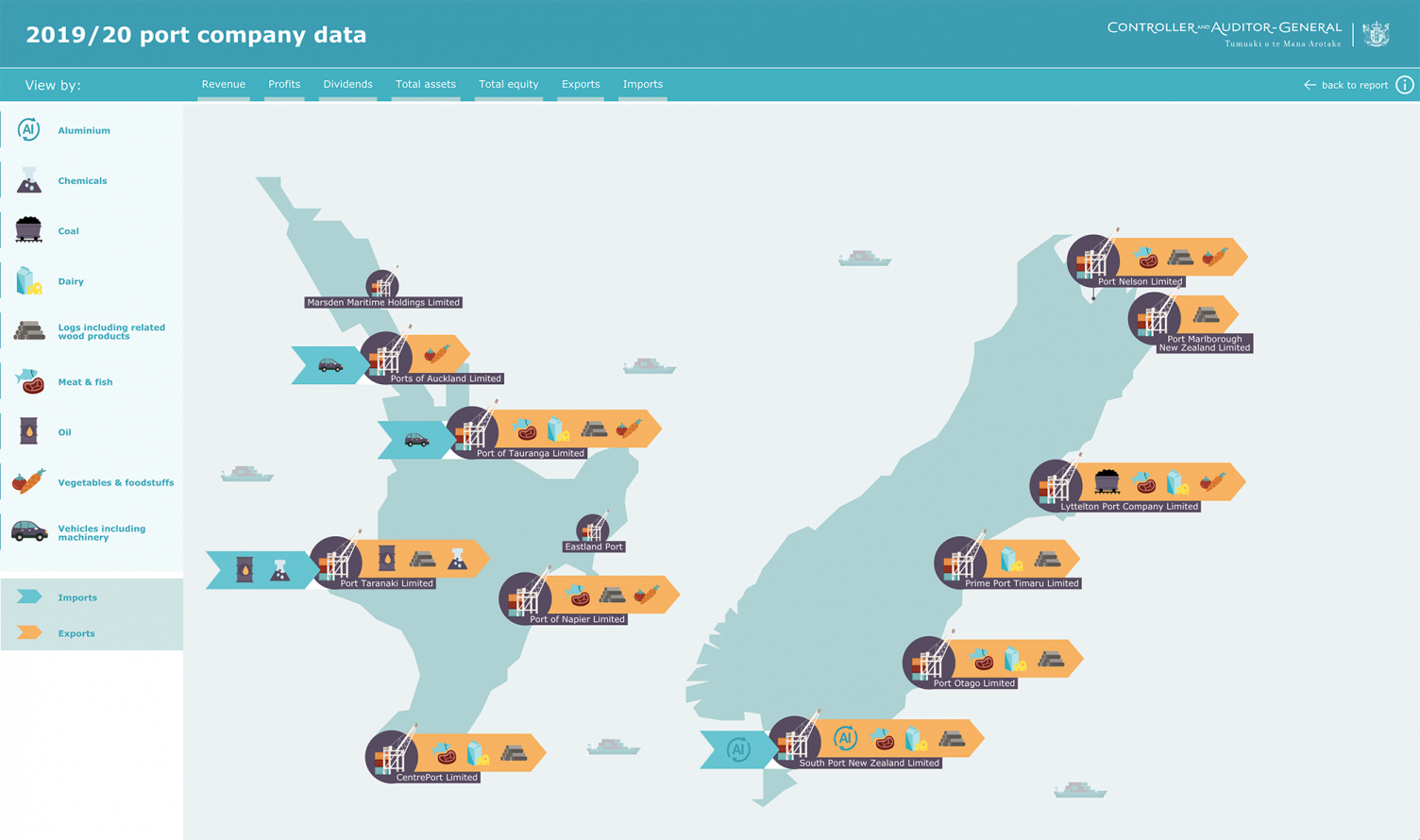The Office of the Auditor-General (OAG) commissioned us to create a visual that shows the ports in New Zealand. The interactive website solution we came up with highlights the differences, imports and exports, and financial data of each port. This project was smooth sailing and we love the finished product.