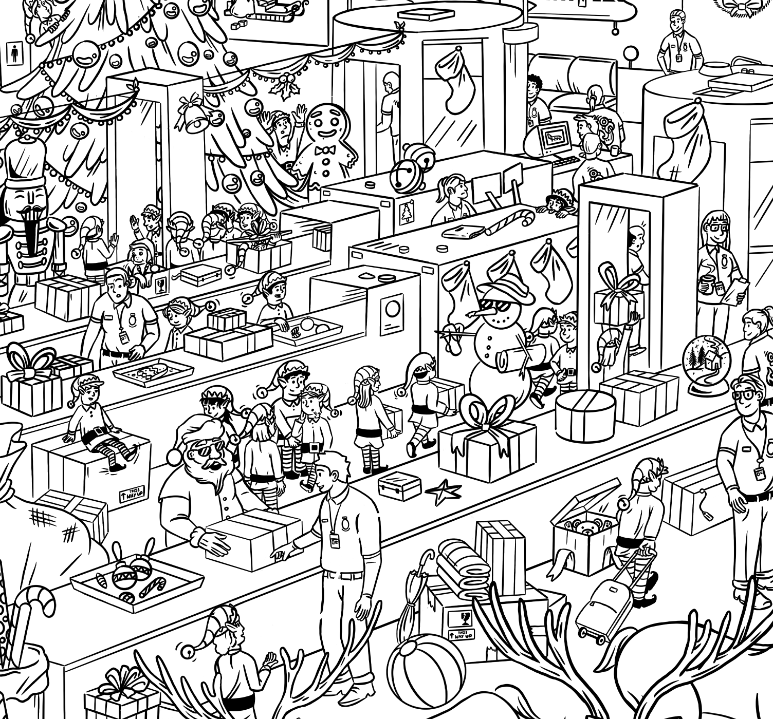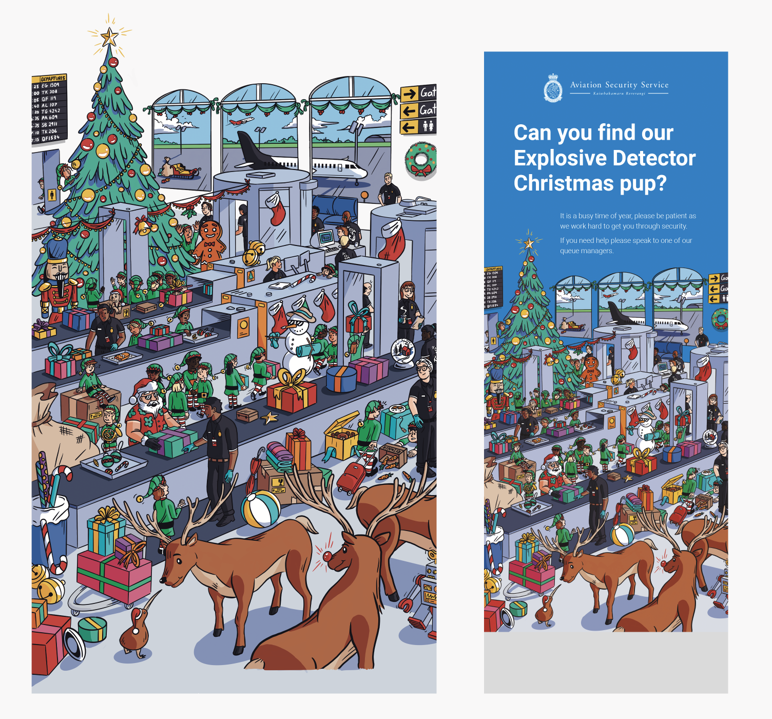We pitched a holiday themed ‘where’s wally’ style illustration of the security screening process, to keep travellers entertained and distracted during the potentially long wait to get through the gates at NZ airports. Our ‘wally’ is the AvSec explosive detector dog, and we had our illustrator place all the studio members of Mark Creative as an added challenge – can you find us all?