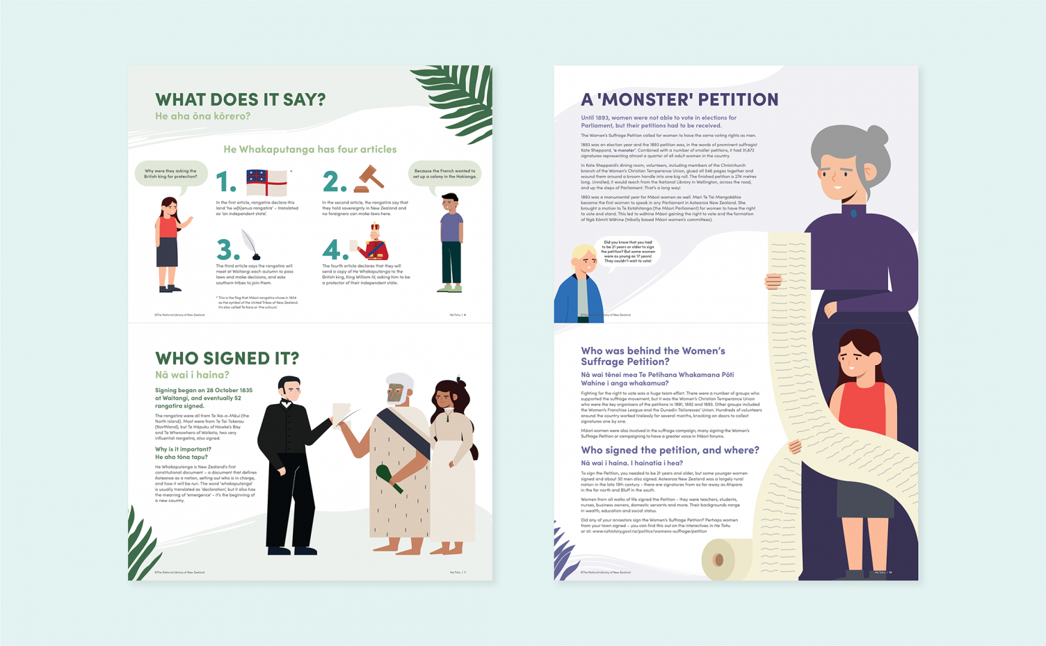 The workbooks we created aim to teach children about the three documents that are the foundation for our country: He Whakaputanga, Te Tiriti o Waitangi and the Women’s Suffrage Petition, as well as, outlining how The National Library of New Zealand Te Puna Mātauranga o Aotearoa cares for them. The taonga housed at The National Library of New Zealand Te Puna Mātauranga o Aotearoa exhibitions and collections help us understand the past so we can better navigate the future.