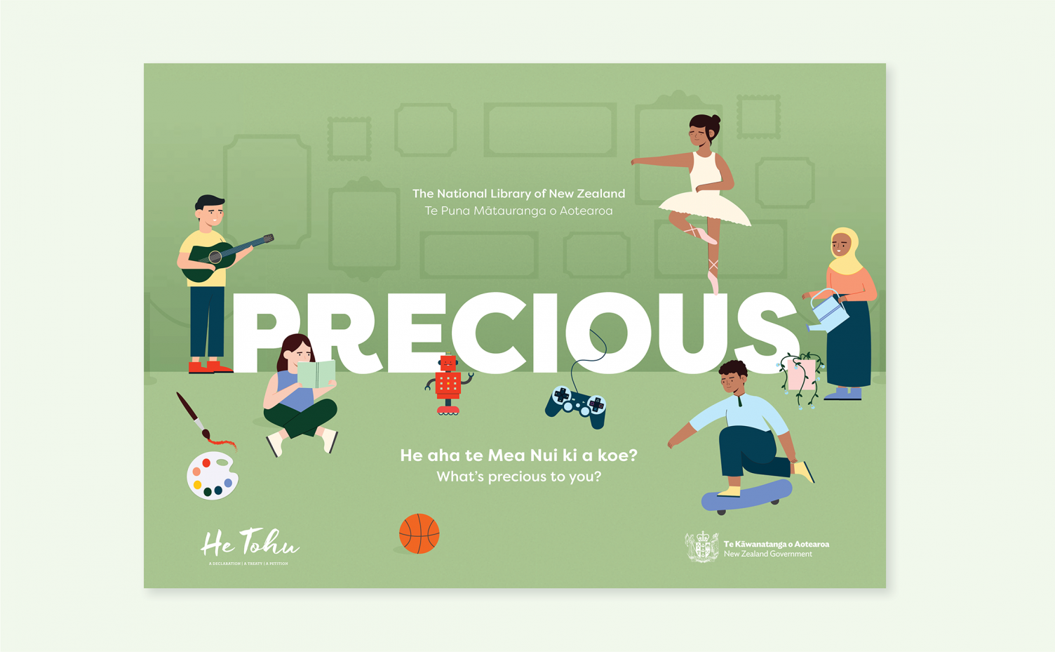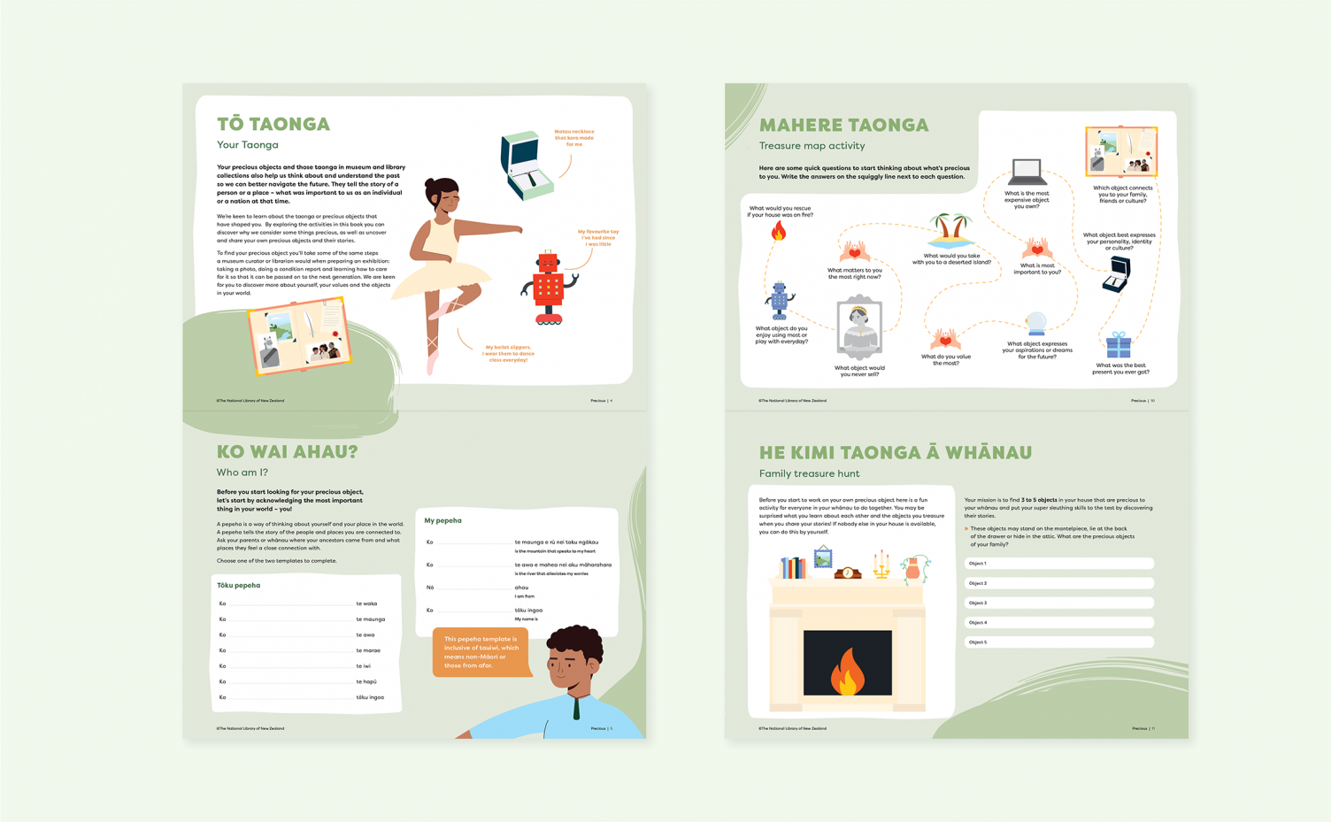 We were tasked with creating two workbooks to guide school-age kids through the He Tohu and Precious exhibitions at The National Library of New Zealand Te Puna Mātauranga o Aotearoa. The He Tohu exhibition displays the taonga of our nation and seeks to educate visitors about our past, present and future – while the Precious exhibition educates visitors on the role of libraries and museums, and celebrates the children who contributed their own precious items to be displayed.