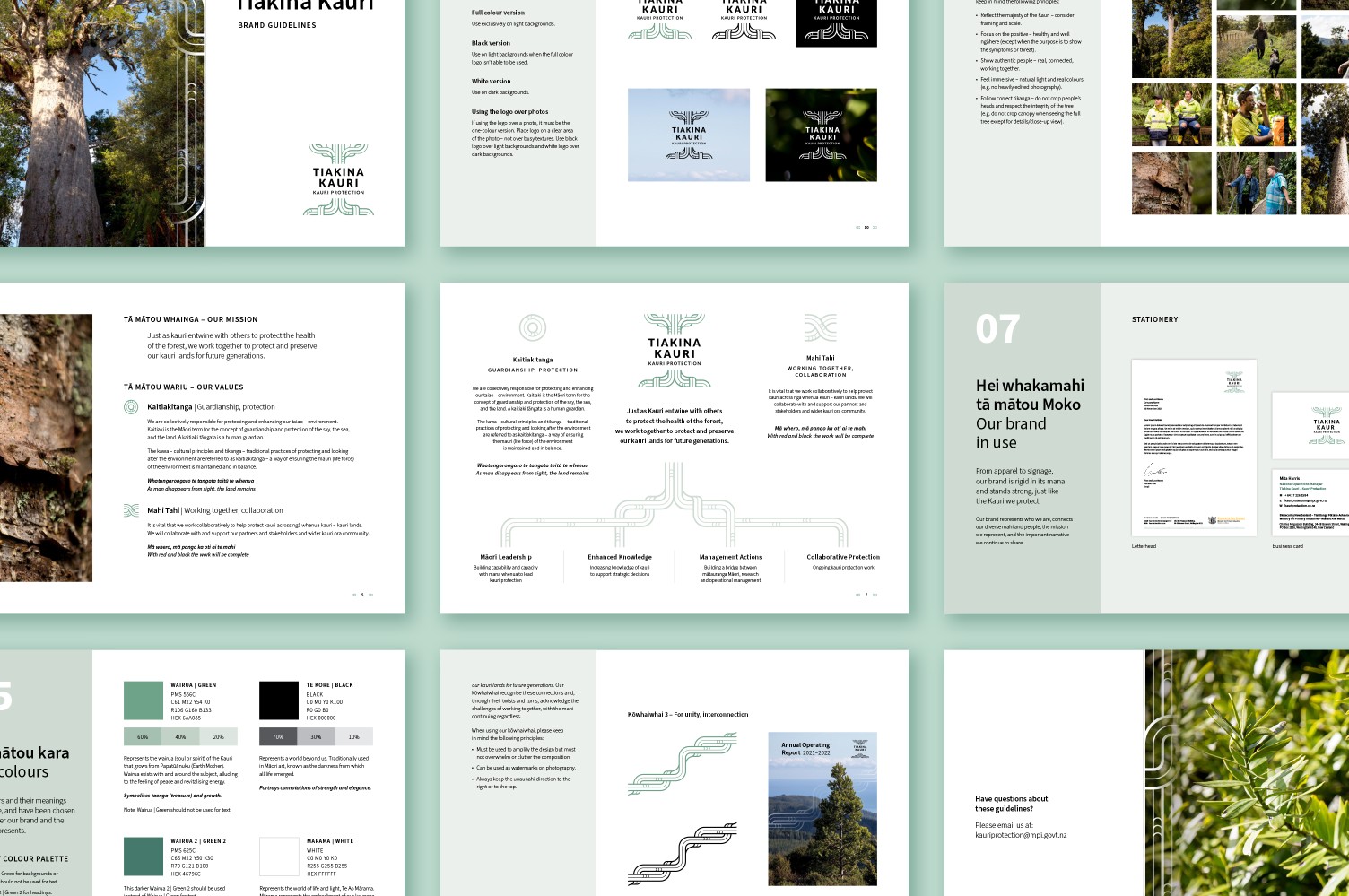The logo is the keystone of the identity. Made up of a unique graphic of the kauri roots and canopy, the new programme name (Tiakina Kauri), and anchored by the primary mission “Kauri Protection”, the logo depicts the binding relationship of the kaupapa.